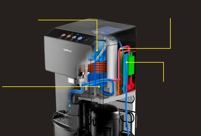 Управління кулером відбувається через сенсорні (електронні) кнопки, які мають відповідну колірну індикацію, яка спрощує розуміння, яка функція в кулері активована. Подача холодної води може здійснюватися, як через сенсорну кнопку, так і через використання безконтактного датчика.